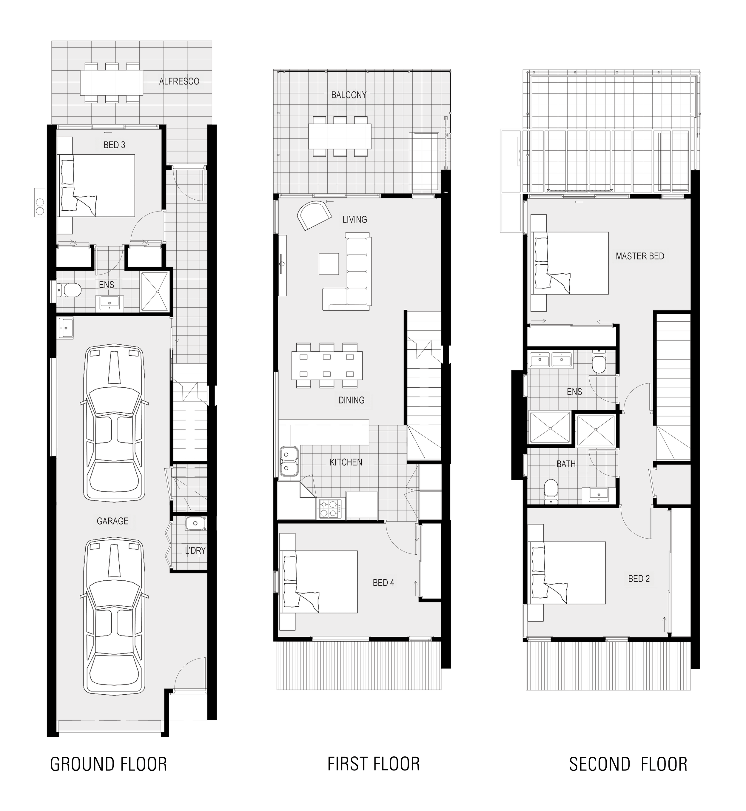 The second style are 3 storey, 4 bedroom townhouses with the benefits of 3 full bathrooms. These townhouses have been designed with one of the bedrooms, which also has its own ensuite, located on the ground floor, and with a multipurpose room located directly behind them. The living areas of these townhouses are on the first level and open out to a spacious balcony which will provide them with seamless access to an alfresco style outdoor entertaining area. These homes were designed in this manner in order to allow complete flexibility with the ground floor bedroom and multipurpose room, so that they can provide independent living where it may be required for an elderly family member or teenage or adult children, or even the flexibility or potential for a live in boarder.